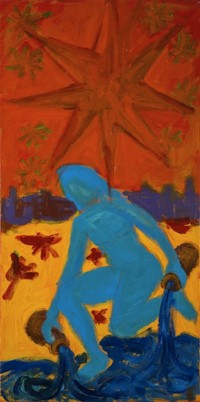 È come se l’artista dovesse contemporaneamente combinare l’oggetto e la sua posizione di fronte all’oggetto; la lontananza, l’ambiguità costitutiva del dato di natura (sigillata nella pronuncia generica di un responso) e l’ambiguità della nostra condizione di esseri interpretanti, di esseri che non possono fare a meno di rinnovare domande. Questa operazione non può che sfociare in una sorta di bizantinismo sui generis, dove il carattere del sensibile - rappresentato dalla decodificazione delle figure - e quello dello spirituale - la loro icasticità originaria - convivono senza giuntura alcuna.